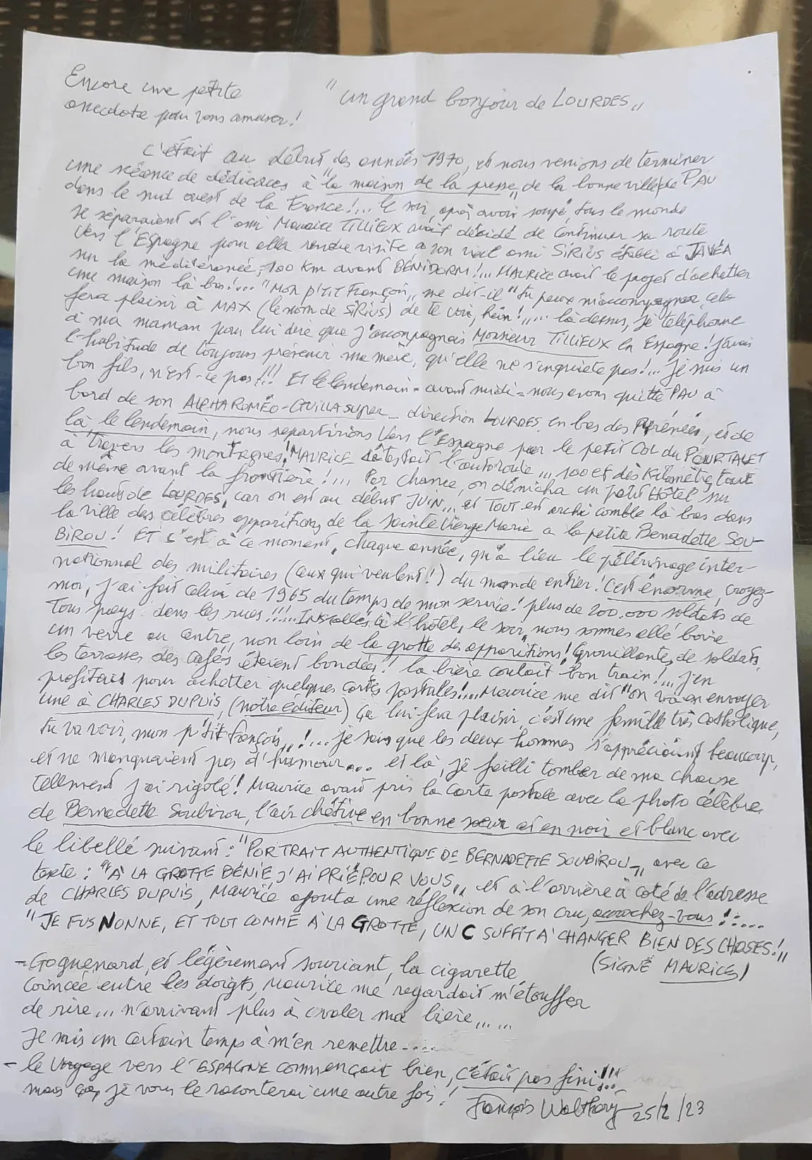 Maurice détestait l’autoroute… 100 et des kilomètres, tout de même avant la frontière !… Par chance, on dénicha un petit hôtel sur les hauts de Lourd, car on est au début juin…tous en archi comble là-bas, dans la ville des célèbres apparitions de la Sainte vierge Marie à la petite Bernadette Soubirous ! Et c’est à ce moment, chaque année, qu’a lieu le pèlerinage international des militaires (ceux qui le veulent !) du monde entier !