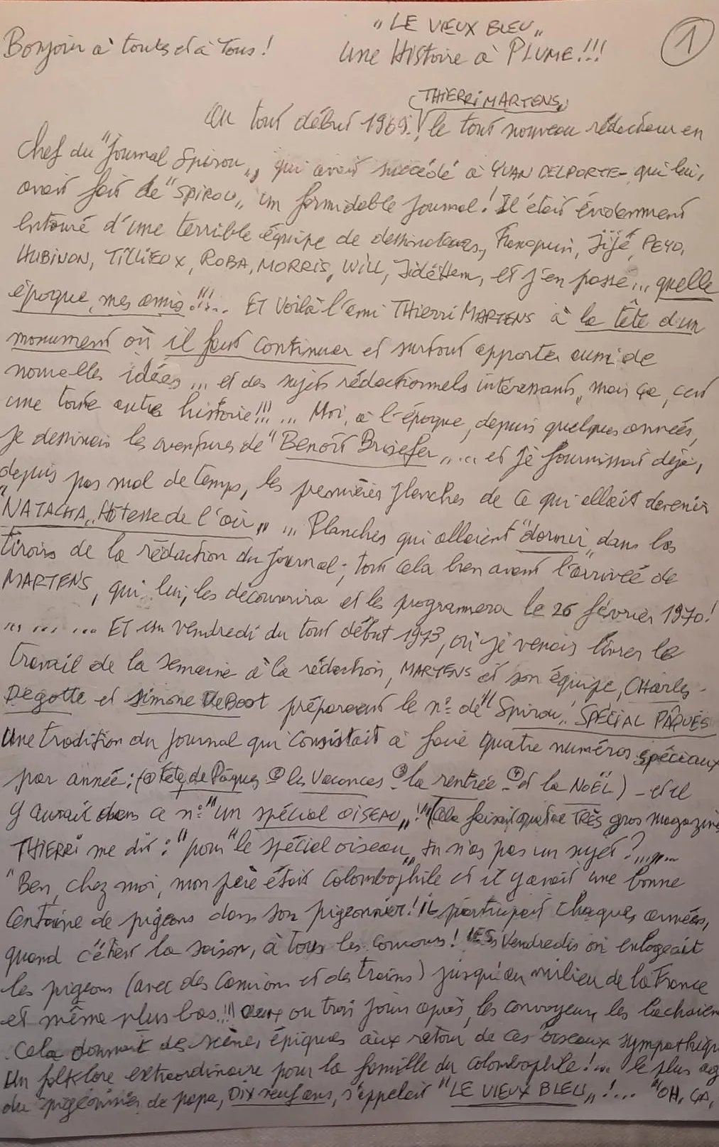 Au tout début 1969, Thierry Martens, le tout nouveau rédacteur en chef du journal de « Spirou », qui avait succédé à Yvan Delporte (qui avait fait de « Spirou » un formidable journal) et entouré d’une terrible équipe de dessinateurs, Franquin, Jijé, Peyo, Hubinon, Tillieux, Roba, Morrice, Will, Jidéhem, et j’en passe. (Quelle époque, mes amis)