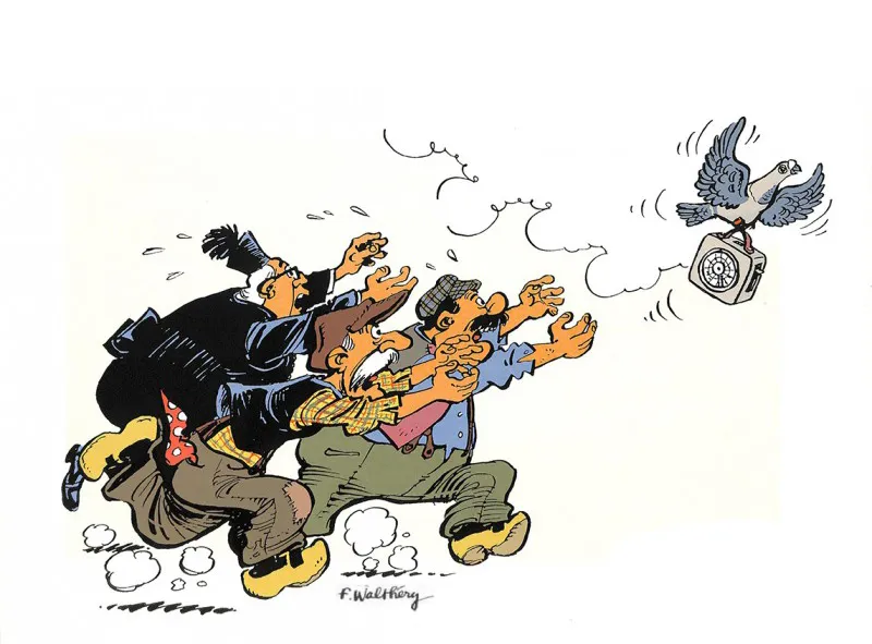 Bref, assis à côté de Raoul Cauvin, je lui fis part de mon idée de réaliser un épisode de 6 ou 7 pages racontant la vie de famille avec un grand-père colombophile acharné ! Et ce, surtout le dimanche et parfois le lundi lors du retour des pigeons dans le pigeonnier à l’issue d’une étape de plus de 1000 km, souvent venant du centre de la France et même des Pyrénées côté français.