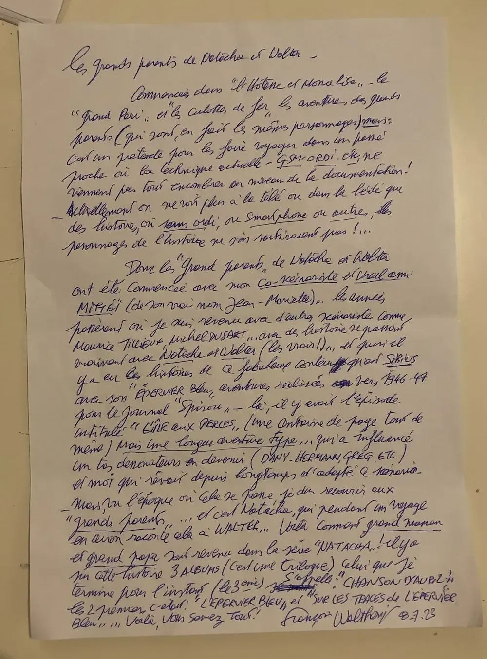 Moi qui rêvait depuis longtemps d’adapter ce scénario, mais vu l’époque où cela se passe, j’ai dû recourir aux grands-parents et c’est Natacha qui, pendant un voyage en avion, raconte l’histoire à Walter.